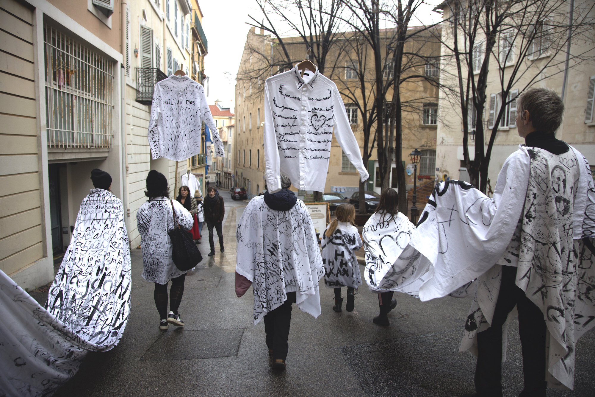 L’ensemble des vêtements réalisés sur le temps de la résidence – mes productions personnelles (série de peintures Tenues de combat) et les productions des participants aux ateliers collectifs – a été endossé le samedi 4 décembre pour une marche « parade » dans la ville de Marseille. L’occasion ici de créer une « exposition itinérante » dans et pour la rue, de cheminer avec la peinture et le « bruit » des mots.