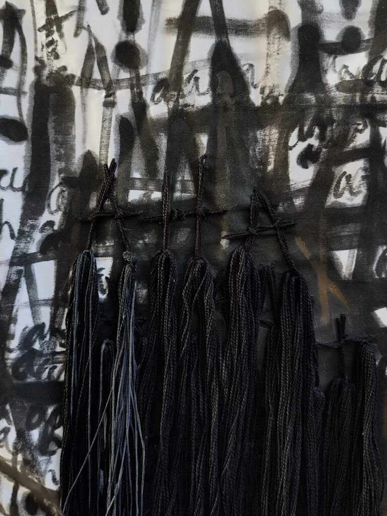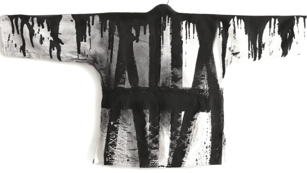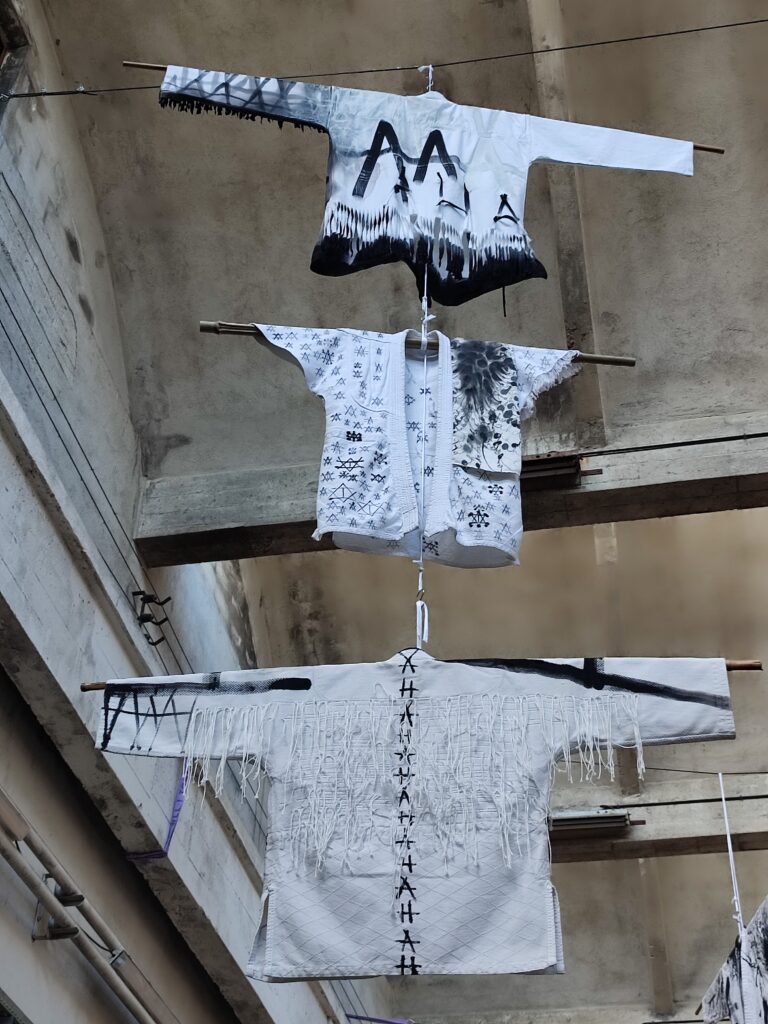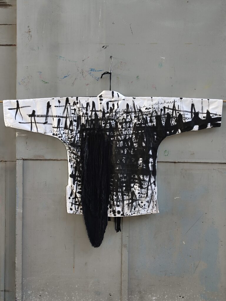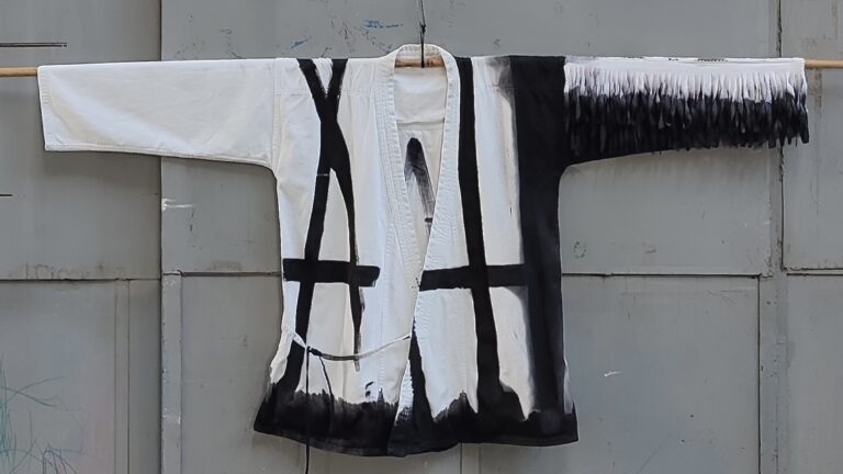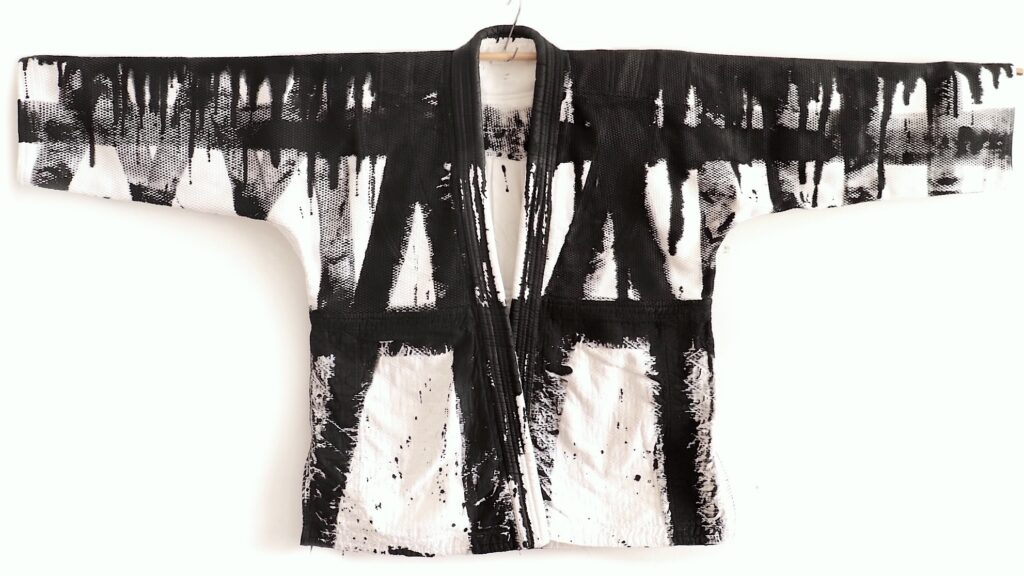 TENUES DE COMBAT, série de 24 peintures - kimonos d'arts martiaux recyclés, encre de Chine, peinture acrylique, textiles et autres matériaux recyclés, 2021-2025 (in progress)