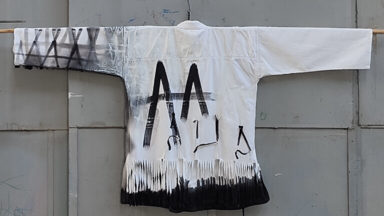 La série Tenues de combat s’inscrit dans une recherche d’ « écriture plastique » et de poésie visuelle. Le texte est ici réduit à l’association des lettres A et H, pour composer l’onomatopée AH et ses variantes – HA, AAAAH, AHAHAHAA… et HA hA, comme dans la « langue » de Bosse-de-Nage chez Alfred Jarry (Gestes et opinions du docteur Faustroll, 1898). Cette poésie visuelle rudimentaire donne une dimension vocale et politique à la peinture, ainsi qu’aux kimonos d’arts martiaux recyclés qui la portent.